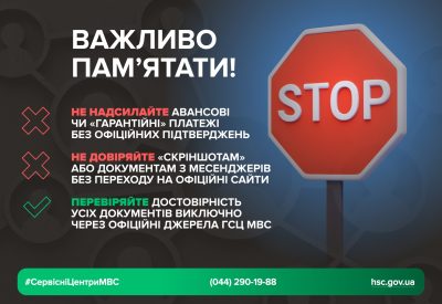 Сайт, на якому ви отримуєте інформацію, повинен розміщуватися на домені gov.ua або мати підтверджену сторінку в соцмережах з синьою галочкою (знак підтвердження верифікації). Не варто надсилати авансові чи «гарантійні» платежі без офіційних підтверджень — навіть якщо продавець виглядає переконливо.