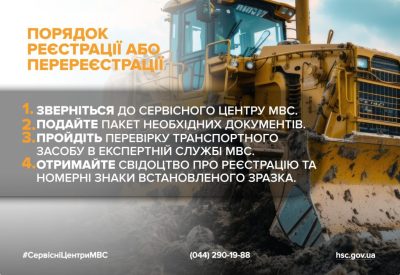 Ця послуга сервісних центрів МВС стає дедалі більш затребуваною серед підприємств і господарств. Вона передбачає оформлення таких машин, як екскаватори, бульдозери, навантажувачі, електровізки та іншої спецтехніки, яка не використовується на дорогах загального користування, але має власний привід і здатність до самостійного руху.